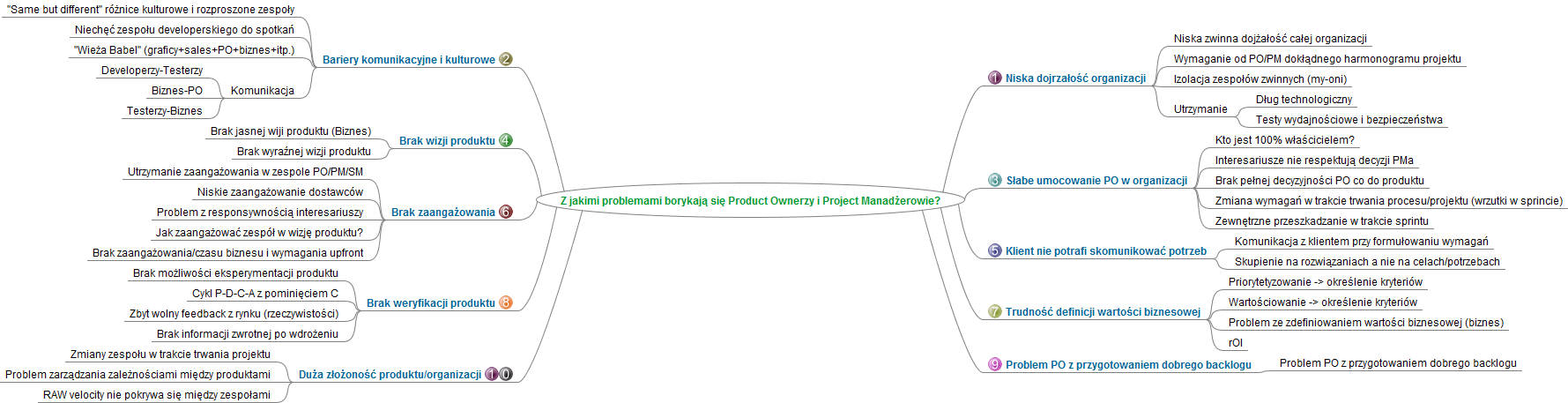 Warsztaty miały na celu zebranie informacji o tym z czym na codzień borykamy się jako PO czy PM. Problemy zostały pogrupowane w kategorie.